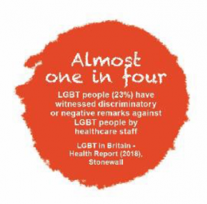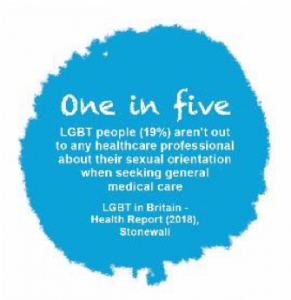 A recent Stonewall survey published in Nov 2018 estimates that one in five LGBT+ people are not out to any healthcare professional about their sexual orientation when seeking general medical care, and one in seven LGBT+ people avoid treatment for fear of discrimination.